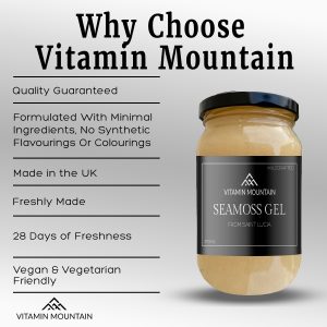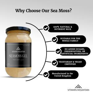 Nutrient-Rich Superfood: Seamoss gel is derived from a type of red algae, Chondrus crispus, and is packed with essential nutrients such as vitamins A, B, C, D, and E. It also contains minerals like iodine, iron, calcium, magnesium, and potassium, making it a potent superfood for overall health and wellness.